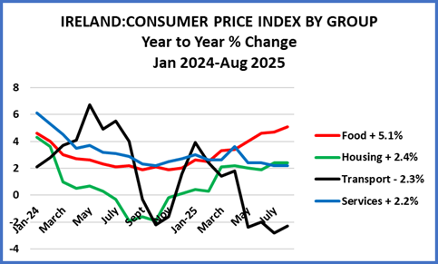 The second graph shows some detail on the Irish CPI for the period to August. The main upward influence is Food which rose by 5.1% in the year to August continuing an upward trend since mid 2024. Housing and Services have risen more moderately but still slightly above the average. The main offset bringing the overall index down to an increase of 2% has been transport which fell by, 2.3%.