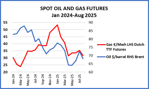 Oil and gas are critically important commodities and major influences on prices. In most of 2024, gas had been increasing in price while oil has been falling. But since the start of this year until recently prices of both have been falling. Despite a slight uptick in recent months, reversed since the end of July, trends indicate that the situation in the Gulf appears to have had a relatively minor impact on prices. Indicators of weak demand in China, the uncertain impact of Trump’s tariff policy and the decision by Saudi Arabia to facilitate lower oil prices, are the main influences.