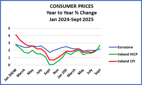 The latest figures on inflation for Ireland released by the CSO show a sharp jump in inflation in September. The Harmonised Index of Consumer Prices, the EU’s measure of inflation, shows a year to year increase of 2.7% for Ireland. This compares with an increase of 1.9% in August and is the largest monthly increase since January 2024. The index also edged up from 2% to 2.2% in the Eurozone. The Consumer Price Index, the measure favoured by the CSO, and more generally quoted, will not be available for a couple of weeks. It has generally been a bit higher than the HICP suggesting that it might be around 3%. Surging food prices are the main reason for the increase.