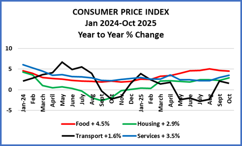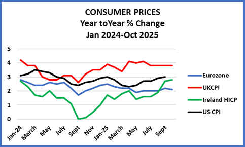 The second graph shows some detail on the Irish CPI for the period to September. The main upward influence is Food which rose by 4.5% in the year to October continuing an upward trend since mid 2024. Housing and Services have risen more moderately but still slightly above the average. There was a sight fall in the rate of inflation in Transport.
